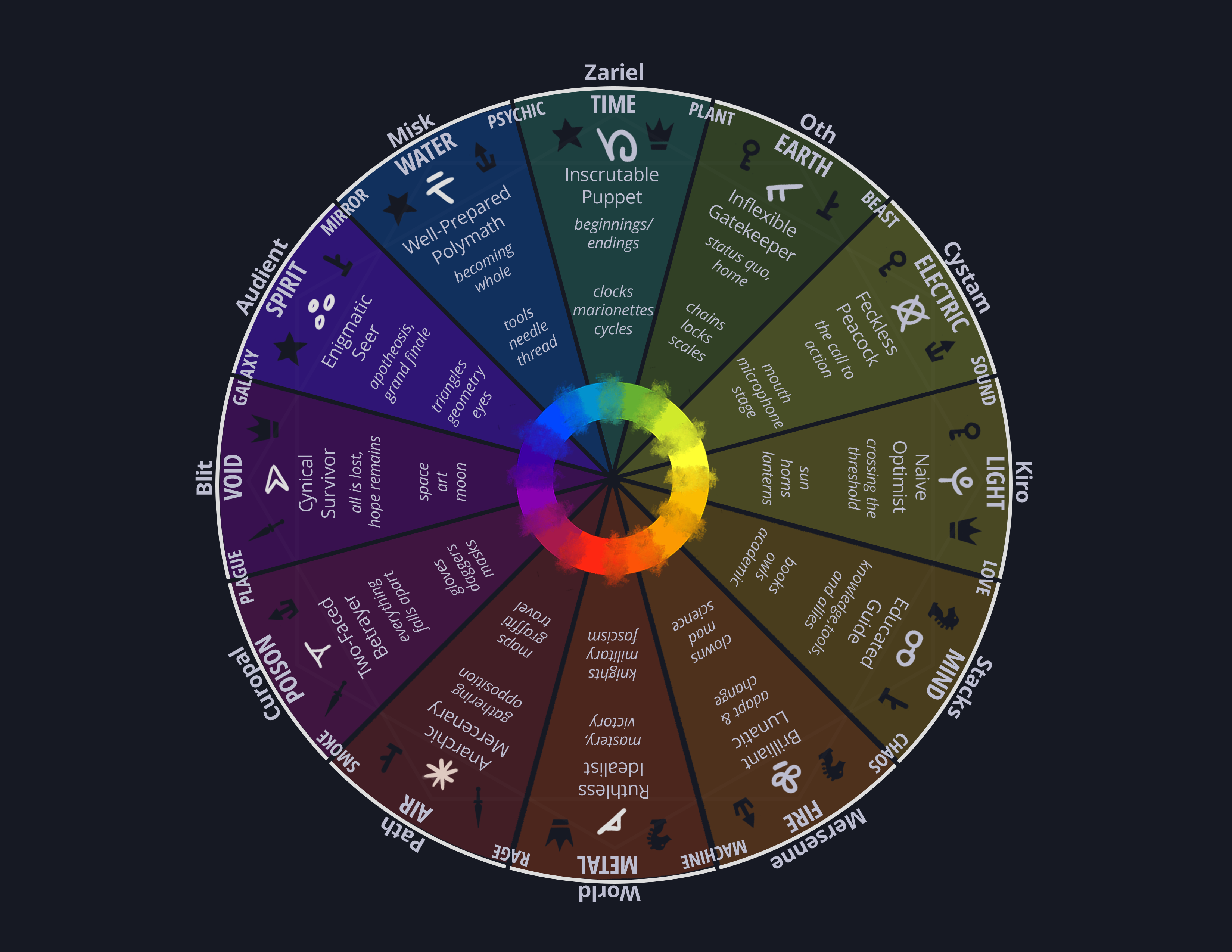This is where we start to tie our loose, emotional, abstract characters to concrete elemental associations and ideas.