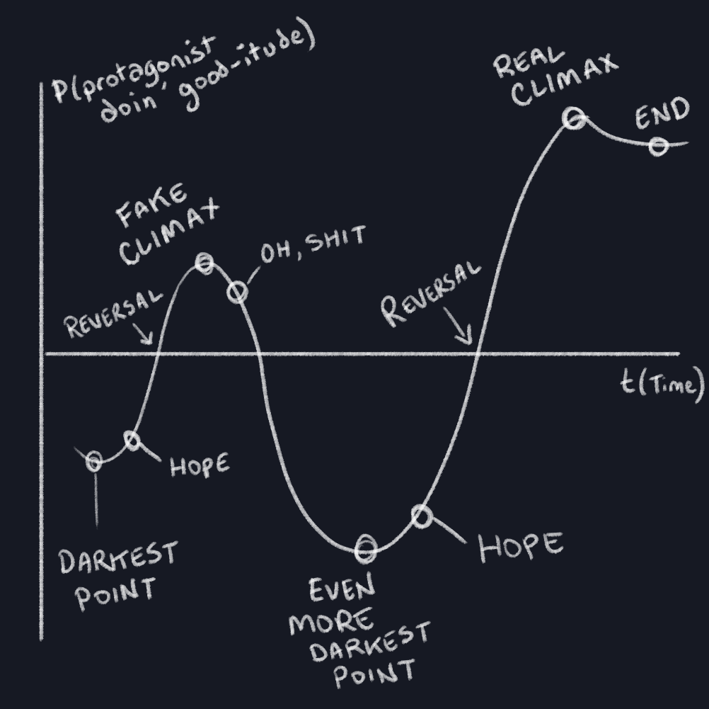 If the protagonist has a really good second act, panic immediately, you are in a tragic story, things are about to go badly off the rails.