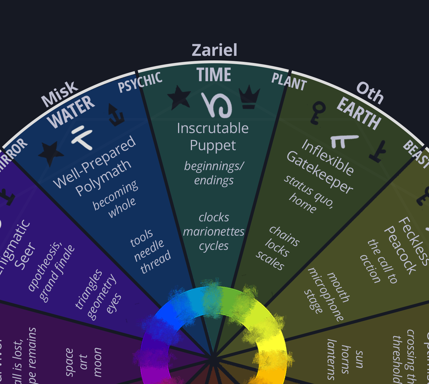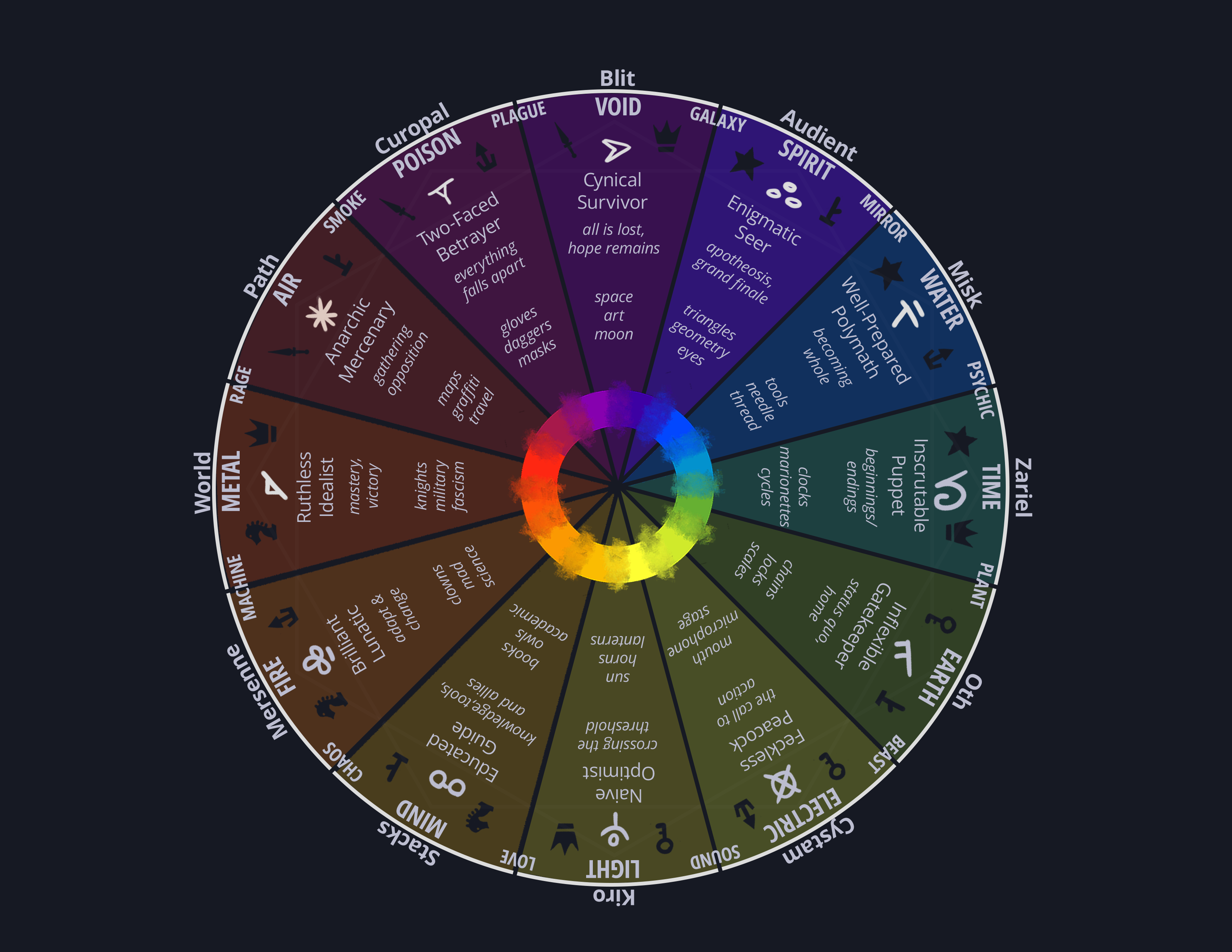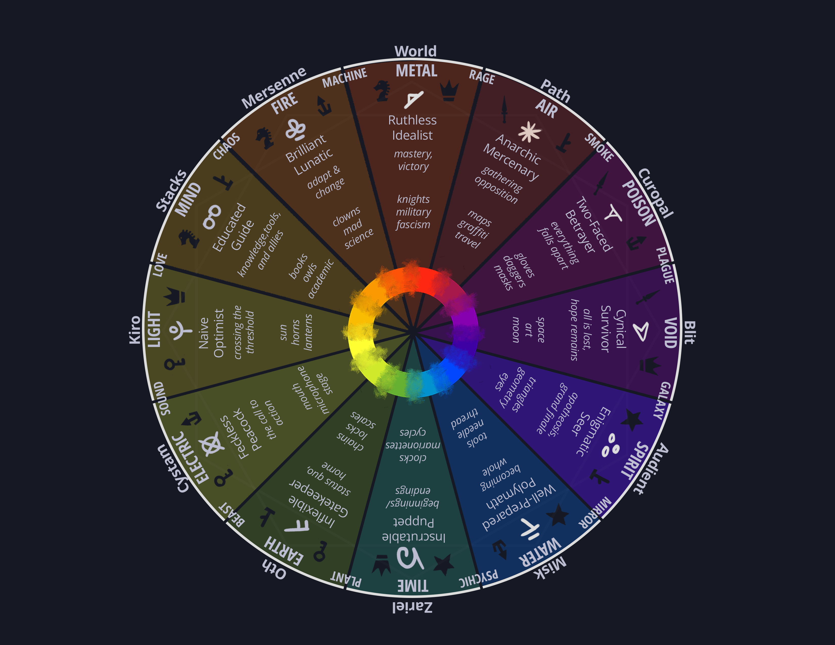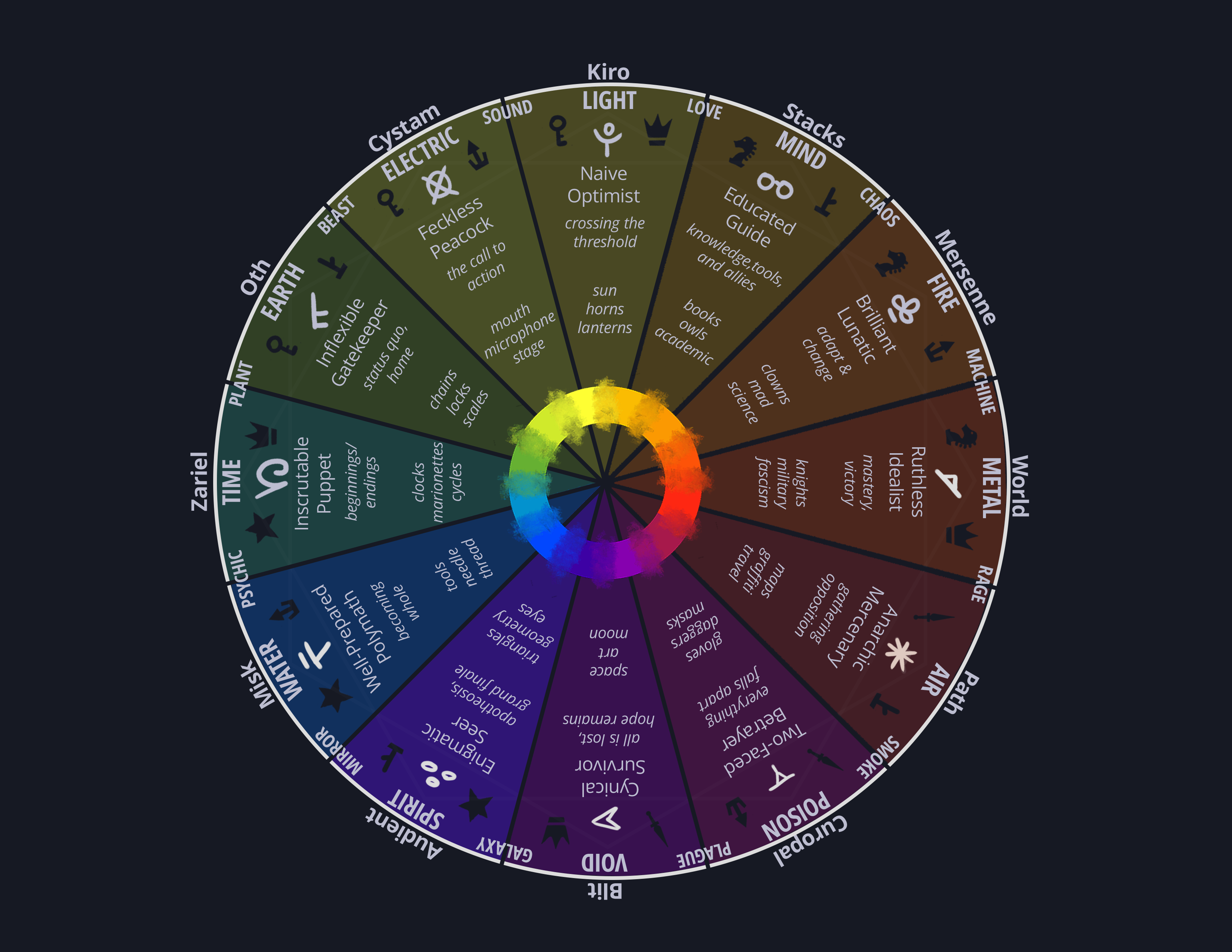 This is where we start to tie our loose, emotional, abstract characters to concrete elemental associations and ideas.