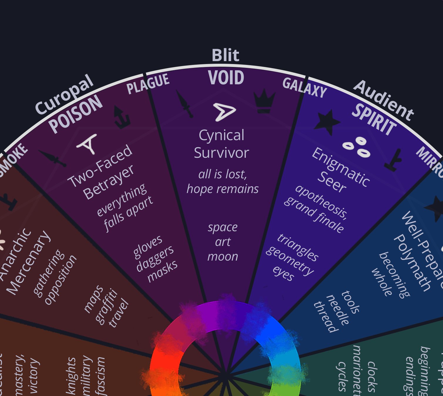 Blit is thematically linked to space, darkness, galaxies, the moon, paintbrushes, palettes, art.